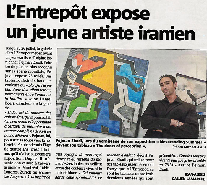 PEJMAN EBADI http://www.artelino.com/articles/pejman_ebadi.asp Pejman Ebadi had his first group exhibition in 1988 in Paris when he was six years old and his first solo gallery exhibition at the age of eight. His works are exhibited all over the world - Montreal, New York, Tahiti, Cannes, Hamburg, Lyon, Bern, Wuppertal and so on and so on. Born in TeheranPejman Ebadi was born in 1982 in Teheran. His family fled from the Ayatollahs to Paris where he grew up. The little boy showed an obvious drawing talent at an age when he was still at nursery school. Since then he has painted incessantly. A Prodigy ChildWhen Pejman was eighteen years old, he had created about 1,500 works of art. The list of his exhibitions has become very long. It looks like the exhibition resume of a middle-aged, internationally successful artist. The young man is fully integrated in his own success. Ebadi is usually present when a new gallery show of his paintings is opened. And it is not only the gallery shows that keep him busy. TV channels such as the main German and French channels report about him. Even Fuji Television Network from Japan or R.F.O from Tahiti broadcast interviews or special coverages of Pejman Ebadi. The hype about the prodigy boy is obvious, but his talent is too. The art works of Pejman reflect the experiences of an adolescent of our times. His images are often violent, aggressive, obtrusive. Others show subtle use of colors and compositions. Astonishing is the great variety and richness of forms, signs, characters and patterns. Pejman's use of color is anything else but arbitrary. The young guy definitely has a great talent. He must be more than the product of a smart art marketing manager. It is the absence of a specific style that shows his real talent. Young stars - no matter whether singers, musicians, actors or painters - often come up with a successful but limited gimmick. They become famous over night, then try to repeat the success again and again and disappear soon, because they are incapable of creating anything else than different variations of one pattern. What Next?Pejman Ebadi's paintings and drawings show elements of all kinds of styles and art movements. Some of his designs look a bit like Joan Miro, other like Picasso or Kandinsky. The young man has not found his style yet. It would be foolish to expect this at his age. And for his development it is better to experience the whole spectrum of modern art styles of the twentieth century. By the time this little article was written (2002), Ebadi has reached the age of twenty. The prodigy child era is over. One can only hope that he survived the hype about his person without taking any damage in his personality and his strive to become a great artist. Might Pejman Ebadi one day become a kind of "Picasso" of the twenty-first century? Only time can tell. His art work sells well. And his paintings and his drawings on paper are still very cheap. They might be worth a fortune in twenty years from now. Speculation should not be the driving force for buying a work of art. But it often is. If you like a work of art and have some prospects it might be something very important and valuable one day - why not. Regard buying an "Ebadi" as Pejman regards painting: a serious play. http://en.wikipedia.org/wiki/User:PhilipASkinner/Pejman_edabi Pejman (pronounced “Payshman”) Ebadi was a child genius. Born in Teheran, he has been painting watercolours of extraordinary depth and sophistication since the age of four. They look like initial sketches from the studios of Paul Klee and Kandinsky. His first solo exhibition was in 1990 when he was eight years old and by the time Ebadi was eighteen years old, he had created around 1,500 works of art. He has no academic artistic training and, rather than using an easel, fixes his supports straight onto the wall or floor. Ebadi’s work expresses the personal views, emotions and experiences of an adolescent absorbing his responses to the world around him. His powerful line drawings often create intense, violent and confrontational images out of a disharmony of colours and a mixture of French and English text. He has had thirty-six solo exhibitions in worldwide venues, including the Villa des Arts in Strasbourg, the Espace Pierre Cardin, Paris, Christian Zeller Gallery, Bern and also in Berlin, Montreal, Toronto, Tahiti, culminating in a Retrospective exhibition at the Arsenal in Metz in 1990. Pejman is now 25 years old. Grosvenor House is the first public showing of a major work by Pejman in Britain.