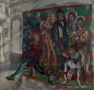 http://www.kabarett.it/roxana-halls-oil-on-cabaret/ Let’s meet Roxana Halls, English painter, winner of the prestigious Villiers David prize in 2004, and charmed by the Berlin cabaret. In this interview she talks about her project Roxana Halls’ Tingle-Tangle, that was exhibited at the Royal National Theatre, South Bank, London in 2009. First of all, let’s talk about the title of this exhibition: Roxana Halls’ Tingle-Tangle. Why is your name part of the title?