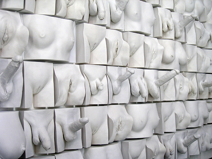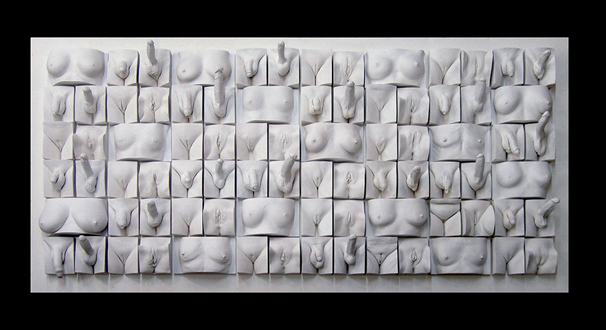 The Spice of Life was commissioned by Amora, an erstwhile sex-education museum in London. The original intention was to use photography to demonstrate genital variety. Jamie however was convinced that casting was a better approach. It shows the exact scale, neatly sidesteps issues of race, avoids comparison with pornography and presents a rare opportunity to really see what other people are like. Amora was persuaded. It was in the process of casting the 18 men and 18 women who appear in this piece that Jamie became aware of how anxious many women are about their genital appearance. Inspired by the effect that seeing these casts was having on his models, Jamie conceived the idea for a larger and inspiring genital artwork to assist women in overcoming their anxieties. The resulting artwork became known as The Great Wall of Vagina and is championed around the world as a game changer in the fight against genital shaming.