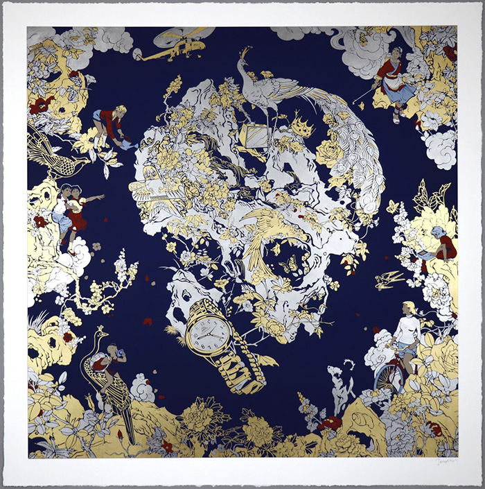 Every month, hundreds of galleries add newly available works by thousands of artists to the Artnet Gallery Network—and every week, we shine a spotlight on one artist or exhibition you should know. Check out what we have in store, and inquire for more with one simple click. What You Need to Know: Founded in 1999, Eyestorm initially focused on—and quickly gained prominence for—releasing limited artist editions. Over the course of more than two decades, Eyestorm has worked with some of the world’s most famous artists, such as Maurizio Cattelan, Damien Hirst, Jeff Koons, and Ed Ruscha, just to name a few, many before they had become household names. Eyestorm continues to offer works by established artists, but also showcases a dynamic and diverse range of emerging artists, creating an opportunity for collectors to invest in the work of early-career artists. In 2011, Henrik Riis, a member of a group of entrepreneurs who acquired Eyestorm, was named CEO, and began a process of revitalization that stayed true to the gallery’s ethos and mission. Part of this included the addition of London-based Chinese artist Jacky Tsai, who at the time was first gaining traction in the art world and has since become internationally recognized and exhibited. About the Artist: Jacky Tsai (b. 1984) has an artistic practice centred on the synthesis of Eastern techniques and symbolism with Western Pop art references, resulting in a unique visual lexicon that simultaneously reflects and comments on contemporary reality. Working with a wide range of mediums, from traditional canvas-based works to NFTs, Tsai’s work materially engages with themes of time, creating work that is in “past, present, and future tenses.” Tsai received his B.A. at the China Academy of Art, after which he relocated to London to study at Central Saint Martins, and in 2022, he was named Artist of the Year by the Digital Art Fair, Hong Kong, celebrating the decade the artist has spent working in both traditional and digital art mediums. His first major museum show, “Life-Fantasy,” in China opened the same year, and he is presently the subject of a solo show at MOCA Bangkok, “Reincarnation,” on view through July 23, 2023. Why We Like It: Tsai’s body of work contains an intriguing series of dichotomies—between the narrative and abstract, serious and humorous, traditional and avant-garde, and, most apparently, Eastern and Western. Often, the antecedents for individual motifs and compositions are immediately recognizable, but when considered as part of the whole, the unique balance Tsai imparts through crafting each work results in something that transcends the individual elements. In Gambling Skull (Jack of Diamonds) (2014), for instance, the overall composition is that of a common playing card with a skull. Upon closer inspection, however, the skull is made up of juxtaposed and overlaid motifs drawn from gambling culture—the teeth are comprised of mahjong tiles, the eyes roulette wheels. The work is from a series of 15 unique playing card compositions. Other works, such as Puppets (2016) illustrate Tsai’s deft employment of Eastern and Western cultural icons. Here, a scene is set within a traditional Chinese puppet house, but the puppets performing are characters from contemporary DC and Marvel comic book universes.