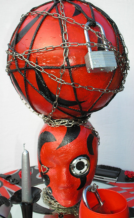 HELEN WARNER "My World has been locked down before the whole world locked down". In the sculpture Feelings 2 there are many objects symbolising my feelings. I felt the need to paint the world red and to have the candle and candlestick and the drinking glass that are on top of the bigger mirror joined together. I felt the need to have rope and chain and to fix the rope and chain around the world and to have a padlock on the world and also have the chain attached to another padlock inside the drinking glass. I also fixed belts, masks, other candles, other drinking glasses, keys, padlocks, two clocks without hands, two mirrors, a glove and other objects to Feelings 2. There is a smaller mirror lower down in the sculpture which is also reflecting some objects and also my signature. I also choose to paint around my hands or fingers all over Feelings 2. I even painted around my fingers onto the bigger mirror towards the top of the sculpture. I love the way that the mannequin head with the world on its head and all the other objects reflect back at each other because they are on top of the mirror. I felt the need to express my feelings using my own objects/possessions or objects that were given to me by people close to me and then fixing them together. It was important to me to use my own personal objects/possessions as much as possible. Although I often wondered what to do if I had no possessions left to use so I decided that whatever new objects/possessions I come across, get given or purchase in life they would become personal objects once they have been around me or people close to me for at least a while so I was happy with that.