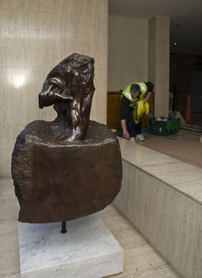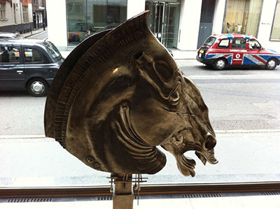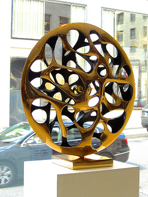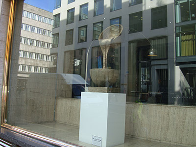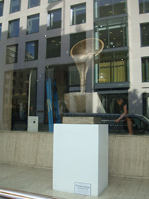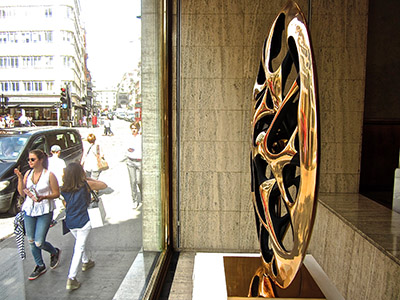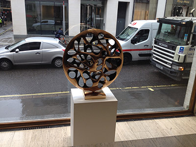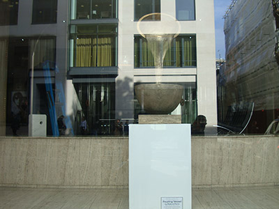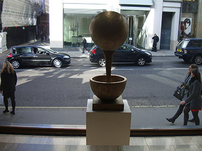 Hay Hill Gallery has previously displayed large-scale sculptures in the main window, including Hand Of God by Auguste Rodin, The Horse Head by Unus Safardiar, several sculptures in the co-operation with arTbridge, and recently (July - December 2014) by invitation of ARTful - Gianfranco Meggiato’s golden Tension Disc With Sphere, and then the Pouring Vessel bronze by Roland Piché. The latter takes inspiration from the artist’s fascination with physics and the meaning of reality, leaving a more specific interpretation up to the passer-by. This piece is an optical illusion; perfectly balanced and appearing to defy gravity.