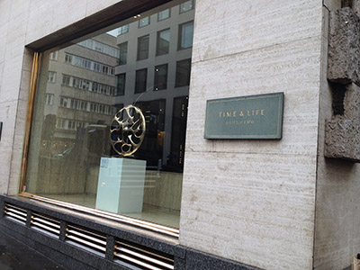 The Time & Life building is a grade II listed building located on the corner of New Bond Street and Bruton Street in Mayfair. Mounted on the transom above the entrance is a nickel bronze sculpture, 'The Symbol of Community' by Maurice Lambert. The architect Michael Rosenauer often integrated art into his designs, and there are also four Henry Moore sculptures visible around the terrace.