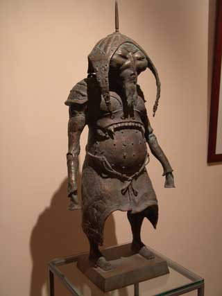 ONCE again Hay Hill Gallery has brought to London the delights of Russian Art with this stunning exhibition of Dashi Namdakov sculptor and alchemist. Namdakov's lyrical and liquid figures cast in bronze and silver conjure the vast expansiveness and mystery of Russia's non-western plainsmen and indigenous people. Dashi Namdakov, born in 1967, lives in the South Eastern part of Russian Siberia, in the Chita region, near the Russian-Chinese border in a small Buryati village near the world's cleanest and biggest fresh water container, Lake Baikal. His father was a well-known village craftsman with versatile talents, making things by hand, furniture, metal handles, carpets and wood-carved sculptures. Working At 18 Dashi moved to Ulan-Ude, Buryati's central city, and started working with the well-known sculptor Gennady Vasilyev. Two years later he entered the University of Fine Arts in Siberia's Krasnoyarsk City, where famous Russian artists Lev Golovnitsky, Yuri Ishkhanov, Azat Boyarlin and Eduard Paklhomov taught his academic art. Dashi Namdakov has been nicknamed the alchemist, observing the beauty of the natural world around him and recreating it in metal. His roots take in both the ancient traditions and the modern history of his country and culture. You find in his sculpture a mix of traditional images of remote Mongolian steppe civilisation from Central Asia - its warriors and beauties, its shamans, totemic animals and mythological creatures. His creations delight the eye and the imagination, making us believe in the reality of story telling. His pieces are strongly influenced by the oriental culture of the east where man and the universe are united, and where everything is an integral part of the ‘universal construction’, and yet he was influenced by Michelangelo. Breugel and Japanese art. Namdakov himself says: 'From my village to New York, I do not have words to describe the distance.' But his technique and craftsmanship, his knowledge of contemporary and modern art forms, testily also to the unifying process of the Soviet workers' revolution of October 1917, which liberated the peasant from ignorance and brought education, art and literature to the remote parts of the region. A revolution which made it possible for a young 'peasant lad' from the remotest inhabited regions to develop and train in the leading Art School in Siberia and to show his art in the State Hermitage, the State Museum of Oriental Art, and the Russian Museum of Modern Art. Dashi Namdakov transforms metal into silky creatures with a liquid and lyrical movement, imagined figures are made extremely tactile. His creatures have a tremendous energy and a magical power to awe, but with a lightness and humour, which delights the eyes and tickles the mind. Warriors and archers feature in Namdakov's work, broad and powerful and yet whimsical and mystified, pitted against a more powerful and mysterious natural world. For the artist, the concepts of a warrior and a sage were one. There are many horses in Dashi's work, reflecting the life of the Mongolian herdsman. In one Chinese legend a Stallion falls in love with his Master's daughter and was shot with an arrow for his troubles. But the Stallion’s skin wraps up the girl and carries her into the steppe where she is transformed into a a strange creature – a huge mulberry silkworm with a horse head, becoming the Goddess of silk-spinning. There is the delightful work called, The Rich Fiancee, in which a young woman riding a stylish mule, laden with a small travel trunk, twists on the horse, looking back at a crowd perhaps as she commences her journey. The ass she rides twists its neck 180 degrees to face the rider, but its eye looks out at the viewers, to bring them into the joke. The Pearl depicts a young woman balanced lightly on a plinth, toes curling upward and skirt blowing round her knees, her head turned away, and in her hand a large pearl. This was cast in three different colours of bronze, highlighting and shadowing and giving the sculpture a depth of texture. The Steppe Nefertiti is the head of a Mongolian woman in the style of the famous Egyptian queen. She is beautiful and peaceful and calm. Dashi prefers to work in bronze as the most visually expressive material. But he has used other materials and techniques. Two of his pieces The Bet and Raven-bird are made of felt and horsehair. Not exhibited but seen in the catalogue. Also featuring in this small friendly gallery hanging above his sculptures are Namdakov's giclee prints of his warriors. This is a new printing technique developed in France where pencil drawings can be projected onto canvas. Dashi creates his own mythology. He re-organises anthropomorphic features and invents fantastic bodies. She-Guardian is a sabre-toothed, winged, wonderful, mythical gargoyle-like creature with eight milk-full teats prancing on claws, staring wide-eyed and warning anyone who comes near. Suggesting the power of nature and of human sexuality, his erotic He and She of redwood and bronze are facing each other - two statues with the heads of gazelles and human bodies, one with women's breasts and six teats, the other with a full erection. The sculptor said: 'Each thing or idea has its own inner logic which dictates the form of expression ... by understanding and following the logic one creates a wholeness out of details.' This is a delightful exhibition and well worth a visit to this friendly gallery.