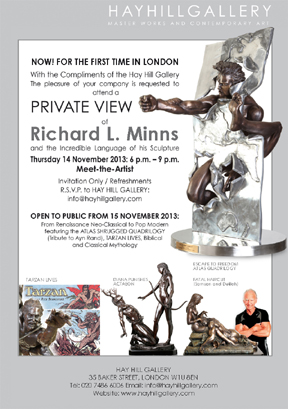 14 November 2013 - Richard L. Minns: Meet-the-Artist Event. The first time in London meet the sculptor Richard L. Minns during the Private View of his sculptures from Renaissance Neo-Classical to Pop Modern featuring the Atlas Shrugged quadrilogy (tribute to Ayn Rand), Tarzan Lives, Biblical and Classical Mythology.