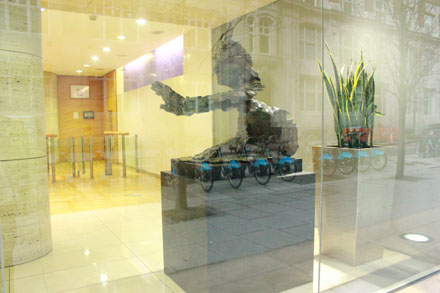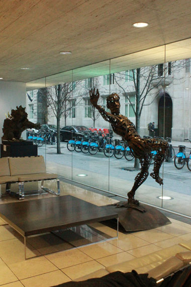 Meets New at 100 Leman Street Hay Hill Gallery is proud to present in co-operation with ARTful Ltd the sculptures of Andrew Cheese at 100 Leman Street. This beautiful glass fronted building is an ideal home for these striking works, a perfect combination of clean lines against rustic patinations. Despite its reputation as a modern business location, Leman Street is shrouded in mystery, hiding an underground ‘ghost’ station which was bricked up in 1941, never to reopen. Just a short walk from the DLR at Tower Hamlets tube station, Leman Street is now easily accessible to visitors to the exhibition. Unafraid to experiment with his work, Andy Cheese often uses a broad range of materials, including stone, resin, wood, steel and plaster. Taking the human figure as a starting point, he plays with the idea of revealing undercurrents of energy inherent within the static. His detailed studies into the movement of everything from dancers to kinetic machines, have led him to produce iconic sculptures such as the works on display at Leman Street: ‘Breaking Through The Wall Of Words’ is a dynamic bronze portrait cast from old printing press letters; ‘Energy’ is a man wound tightly out of copper ribbons springing forward, or falling back; the abstract ‘Movement’ is a sprinter in a race or dancers balancing.In association with Hay Hill Gallery, the sculptures will be on show at 100 Leman Street until the beginning of July 2014.Featured Artist: Andy Cheese |