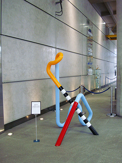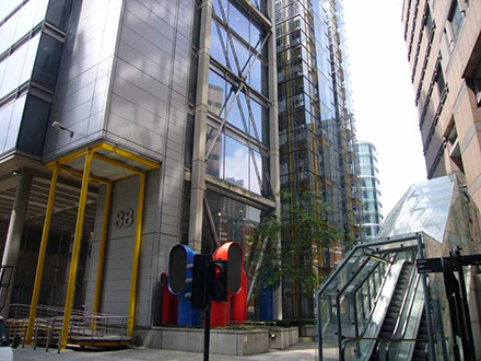 88 Wood Street is a commercial skyscraper in London, located on Wood Street in the City of London. The architect was the Richard Rogers Partnership (RRP), now known as Rogers Stirk Harbour + Partners. The building was constructed between 1993 and 2001. The 18-storey structure has an office space of 33,000 m2 In 1990, following a limited design competition, RRP was commissioned by Daiwa Europe Properties to design their new London headquarters on a site at the corner of Wood Street and London Wall. The twin economic recessions that hit Europe and the Far East, however, obliged Daiwa to rethink its strategy and the prestigious headquarters project was abandoned. The site stood vacant for three years, after which a new brief was given to RRP to design a speculative, high-quality, commercially lettable building, larger and more economical than its predecessor. The site lies at the heart of the City of London, between St Paul's Cathedral and Moorgate. It previously housed two telephone exchange buildings, one of which had been spot-listed prior to the commencement of the works. The building was subsequently de-listed and demolished along with a 1960s office building. Within the existing basement, however, was a fully functioning British Telecom exchange chamber, which was required to remain in operation during demolition, construction and occupation of the new building. Eighty-eight Wood Street is adjacent to the tower of the Grade I listed St Alban's Church, designed by Sir Christopher Wren (the remainder of the church was destroyed during World War II). In addition, the site is bounded by two historic churchyards; St Mary's to the south and St Olaves to the west (the latter destroyed in the Great Fire of London) . Surrounding the site are various contemporary buildings ranging in height from four to 23 storeys. Planning permission was granted for the initial headquarters scheme in 1992. The development was the subject of protracted and complex planning negotiations with the Corporation of London planning department especially in relation to viewing corridors from the South Bank, St Paul's Cathedral and the Barbican terrace. In order to avoid resubmitting a new application, the development envelope established by the initial application was adhered to for the second design, despite the requirement for more floor space. The 33,000 square meter building is arranged as three linked blocks of office accommodation that step up from eight storeys on Wood Street, where the context includes two listed buildings, to fourteen and finally eighteen storeys to the west, responding to the taller built topography towards London Wall. By using the extensive basement of the demolished telephone exchange for plant, roof levels were kept largely free. The office wings are constructed of in situ concrete which contrasts with the lightweight, steel-framed service towers containing toilets, lifts and dramatic, fully glazed stairs. The use of brilliant colour enhances their impact - air intakes and extracts at street level are also brightly coloured, contrasting with the neutrality of the occupied floors. The generosity of the scheme is reflected in the spacious, 8 metre-high entrance lobby, floored in granite as an extension of the external landscaping. This reception area features a 54 metre-long wall running the length of the building. The facades of the main office floors are glazed from floor to ceiling to maximise daylight and views - in addition, levels 8, 12 and 16 lead directly onto roof terraces with spectacular views over the city skyline. Hay Hill Gallery is collaborating with ARTful Ltd, exhibiting contemporary sculpture at the entrance hall of 88 Wood Street business centre. Featured Artist: Sam Shendi’s works references the work of “minimalism”, the style of paring-down design elements and focusing on the medium of steel, aluminum and paint. Some of his works are deceptively simple in form but include the qualities of metaphorical associations, symbolism and suggestions of spiritual transcendence.