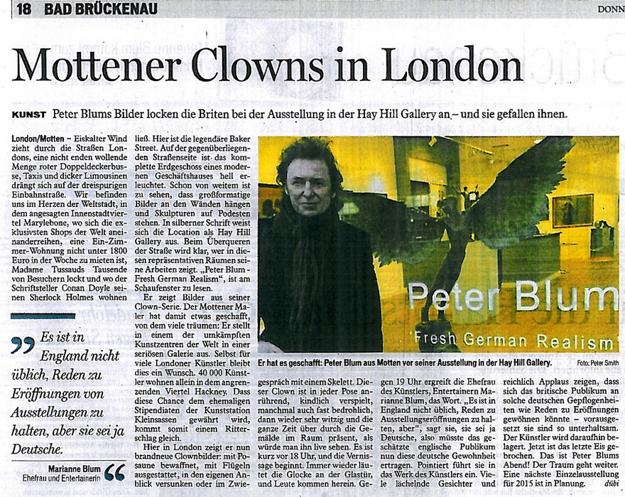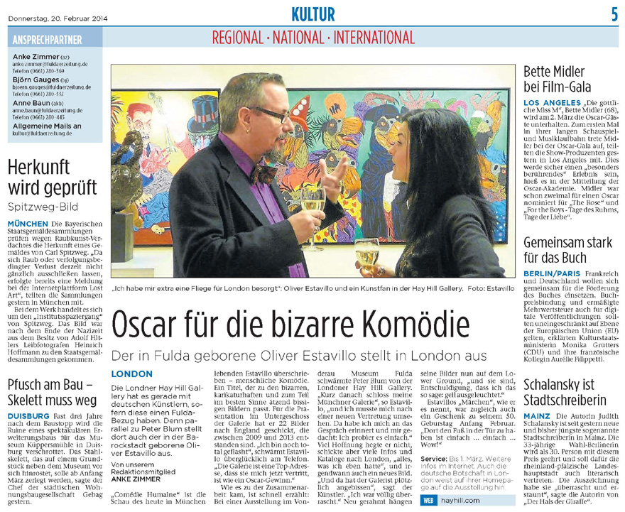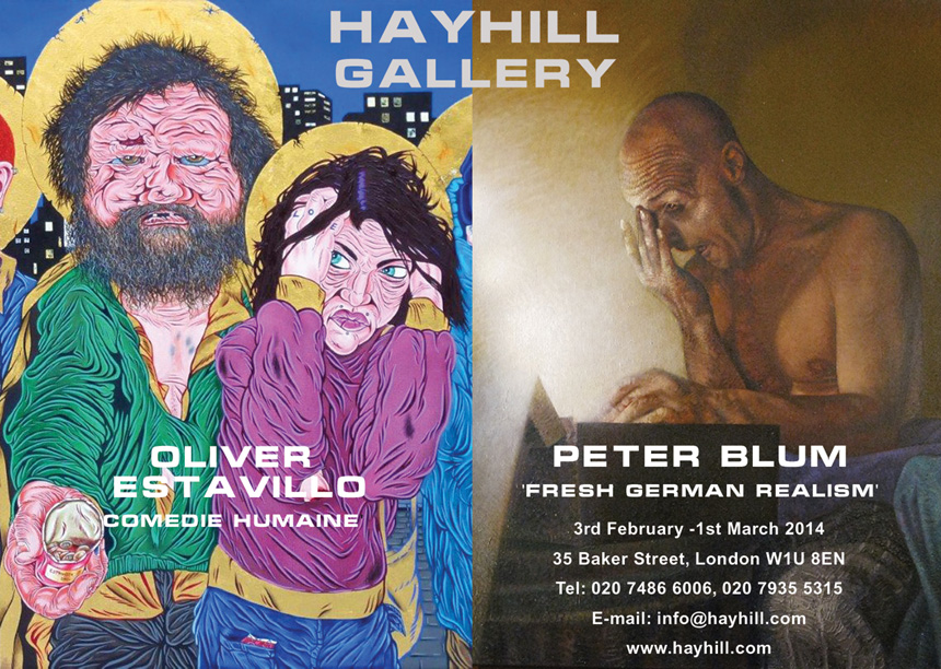 HAY HILL GALLERY DOUBLE EXHIBITION IN FEBRUARY Hay Hill Gallery are presenting a double exhibition this February, featuring the established German artists Peter Henryk Blum and Oliver Estavillo. Differing wildly in style, these two shows contrast each other perfectly whilst connecting in theories of what it is to be human.Peter Henryk Blum is one of the most exciting German figurative artists of his generation. Using the Old Masters techniques of layer and glaze painting, his scenes are muted, selective with colour, like silent film reels and tinted sepia prints. Players are staged in ironically self-conscious poses where the melancholia of sad harlequins and heavily made up women is reminiscent of physical theatre. Light hearted or darkly surreal, the works are unsettling because it is clear these people are not alone in their secret rituals. Struck dumb, there is someone watching in the wings - and that person turns out to be you. Oliver Estavillo has been referred to as 'Pop-Brueghel' and 'The Tarantino of Painting'. His inspiration is taken from everyday life; the bizarre neighbours, serial killers, boring aunts and shrill parties. Ladies with budgerigar heads and droopy hats wear their pearls high to disguise crepey necks and sagging jowls. These are places where the meat-mottled women drink wine and fanged stags brawl under neatly mounted taxidermy testicles, operatic gatherings of tentacle-headed lurkers and emperors in need of new clothes. This ultra-violent fantasism scratches beneath the glittering surfaces to expose decay, confronting us with our own selfish bloodlust. The exhibition will be held alongside a sculpture collection which features works by Eleanor Cardozo, Nicola Godden, Richard L.Minns, Andy Cheese, Jamie McCartney, Ian Edwards and Palolo Valdes.Marylebone Journal, February/March 2014