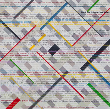 In 2010, Larry McGinity began a new series of paintings driven by a growing interest in the way economists, financial journalists and market players explained the ongoing financial crisis. He extensively researched financial media in the UK, US and Europe going back to 2007. From these assembled texts, he has created 14 thematic paintings in which some 1500 words of verbatim text relevant to each subject have been employed. Each artwork focuses on a separate aspect of the financial crisis such as Subprime, HFT, Wall Street, Derivatives and City of London.