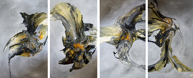 Working on large canvases, diptychs and triptychs, Petrovic creates multi-layered paintings with such vibrancy, depth and colour that they create the illusion of a transparent, glass-like world. This dramatic effect is achieved using acrylic and oils with varnishes and resins to execute glossy flowing images onto matt backgrounds. With a chemist as a partner, Petrovic can work with unique formulae, achieving paint that shimmers. The artist combines textures and pattern with abstract mark-making and his unusual technique works beautifully.