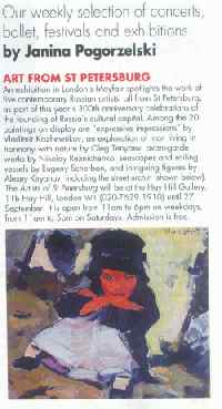 The Artists of St Petersburg will be at the Hay Hill Gallery, 11b Hay Hill, London W1 (020-7629 1910) until 27 September. It is open from 11am to 6pm on weekdays, from 11am to 5pm on Saturdays. Admission is free.