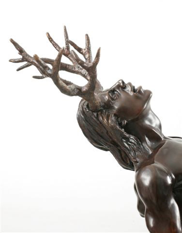 Sculptor’s Interpretation: “I have been greatly influenced by Bernini’s marble masterpiece of APOLLO AND DAPHNE in the Galleria Borghese, Rome. Apollo, Diana’s twin brother, also god of archery and of the sun, was the victim of Cupid’s (Eros) golden arrow which made him fall madly in love with the beautiful nymph, Daphne. However, Cupid shot Daphne with a lead arrow to make her reject Apollo, so we have the climax of Apollo’s fiery passion and Daphne’s cold resistance. The conclusion: just as Apollo grabbed Daphne she called upon her father, Peneus, the river god, for help, and she was immediately transformed into a laurel tree. Thereafter, in perpetual eternal mourning for his lost love, Apollo wore a headband of laurel leaves. “The Master Bernini successfully captured the moment and the metamorphosis when Apollo grabs Daphne who is turning into a laurel tree before his eyes. “My interpretation of ACTAEON’S metamorphosis starts with a very regal, very angry DIANA, whose nude privacy has been invaded by the eyes of a man. She has stepped out of her bath. Her long wet hair clings to her body. Her first instinct as goddess of the hunt was to grab her bow and destroy ACTAEON with one of her silver arrows. Instead, she decides to spare the handsome hunter’s life by throwing water on him, turning him into a stag, not realizing that his own hunting dogs would turn on their master. “My DIANA casts her spell on ACTAEON who kneels at her feet, helpless, pleading for mercy as the metamorphosis starts to take place, full stag’s horns already sprouting from his head. “I’m no Bernini, but I think I captured the moment. “This is intended to be my last DIANA. However, when I was recently in London, I photographed the current Miss Universe, who has also been a ballerina. If I can work out logistics so she can pose for me, there may be a Fourth DIANA.” RICHARD MINNS