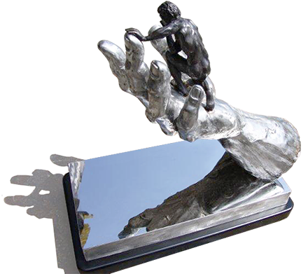 “In “Creation Of Adam III”, my bronze Adam springs to life inside God’s huge, powerful, stainless steel Hand. God’s stainless steel forearm rises in a 45 degree angle from a highly polished stainless steel base, which acts as a mirror, reflecting a double-image of the back of God’s hand.  An original foundry-photo I took outside showing God’s Hand mirrored against a reflection of the blue sky demonstrates the wonderful images one can enjoy from the combination of bronze and polished stainless steel.”
