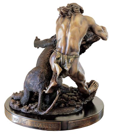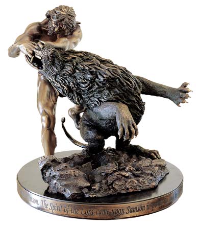 Description of Sculpture Richard's Samson Slays the Lion is a beautiful ballet. A dance. This supreme primitive life-and-death battle of man against beast, muscles and sinews against muscles and sinews, culminating in a balletic dance of death, has fascinated artists, sculptors and writers from the Greek and Roman Old Masters to Hemingway. This sculpture is another example of Richard's mastery of anatomy. This time Richard exhibits his mastery of the anatomy of the lion as well as the anatomy of man. The architectural design of the sculpture is itself a work of art. The front view shows that Samson and the lion are separated, with Samson's head and weight directed to the left, whereas the lion's weight and head go to the right, making a perfect “V”. Note the wonderful muscular development of Samson's back and shoulders; his powerful deltoid and tricep muscles; his determined face, where he is biting his lower lip; the strength of his left knee buried into the lion's back; the toes of his left foot digging into the lion's fur; his right leg rigid (the source of his body's power) and braced against the stone. This is a sculpture of which you will never tire, because every time you see it, as the angle changes and the lighting changes, you will observe something new and exciting.