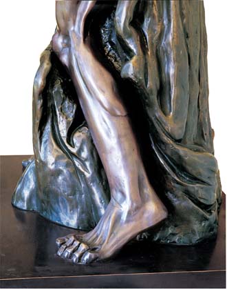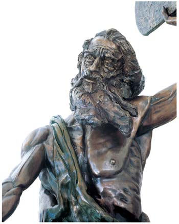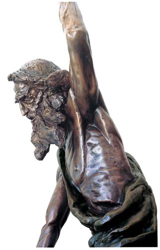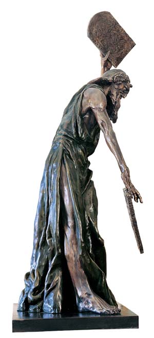 Artist's Interpretation: “I must give you some background, which you already know, so I can properly convey my passion. My MOSES has spent 40 days and 40 nights on Mount Sinai. His people did not believe any man could survive this long on Mount Sinai, alone in the wilderness under the scorching sun without food or water, so they were sure that MOSES had perished. They lost their faith, which was largely based on their reliance on MOSES strength and indomitable will, which enabled him to deliver them from Egyptian slavery across the Red Sea to freedom. With their belief that MOSES had perished, they lost faith in MOSES and in G-d, reverted to their pagan ways, and started worshipping the golden calf idol. “MOSES did survive and when he arrived, barefoot, with his clothes in shreds, half-starved, but exhilarated, with the two Commandment Tablets from G-d, he was horrified at the above sight. He was betrayed. G-d was betrayed. The once-coveted Tablets become burning red-hot coals in his hands. He can't bear to hold them any longer. Tired, but overwhelmed with the shock of betrayal, my outraged MOSES is throwing the Commandment Tablets to the ground. His right arm has swung down. The tablet has left his outstretched hand, and I have tried to convey the impression that the tablet is in the air, falling. MOSES left arm is raised over his head preparing to hurl down the second tablet. “Anatomically, my MOSES is old, very lean, starved, with ribs protruding, but still a very strong man with old but firm muscles and tendons attesting to his work as a shepherd. I have over-emphasised the veins on his arms and hands to combine strength and strain with pathos. I have tried to capture the mixture of sadness, shock, despair and rage in his weather-beaten face and eyes.” MOSES face, eyes and hands dominated my dreams. I could think of little else until I completed the sculpture.” Richard Minns |
