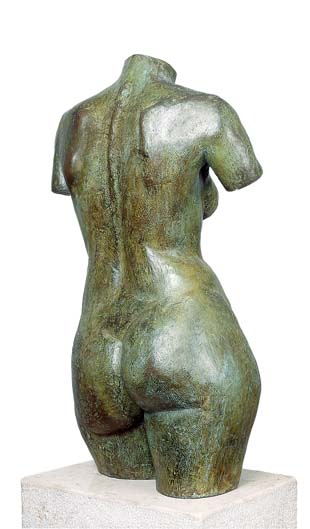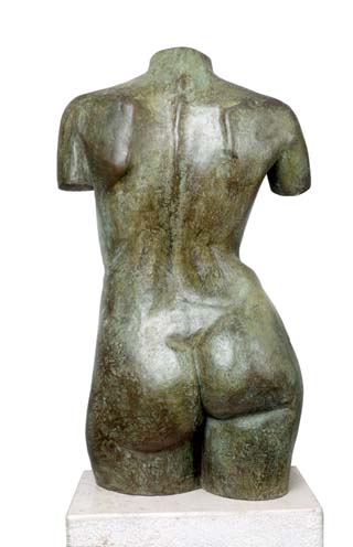 Richard presents EVE: a Venus d'Milo-style torso. the first woman and the first temptress. Here Richard created an original bronze torso in Venus d'Milo-style. Eve has a texture totally different from the smooth marble-like gentleness of Bathsheba. The texture deliberately shows the artist's tool marks with a green antique patina to emulate a Greek archaeological discovery. Here is a more mature woman, made for child-bearing, the mother of all mankind, full-breasted with broad hips, round buttocks and heavy thighs proudly flaunting her voluptuous attributes.
