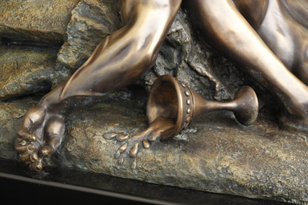 “In Rubens’ painting, the focal point is Samson’s profile and his huge muscular outstretched arm. My sculpture has many focal points and is actually a pause in the middle of many actions occurring simultaneously:  Samson’s sleeping profile in Delilah’s lap and his huge muscular outstretched arm ... the wine spilling ... Delilah’s right hand holding the knife and her left hand holding up Samson’s hair ... and Delilah in the act of cutting Samson’s hair.  Also I wanted to convey the impression that Samson was melting into Delilah with a submissive sense of tiredness over his whole features and body.