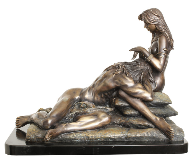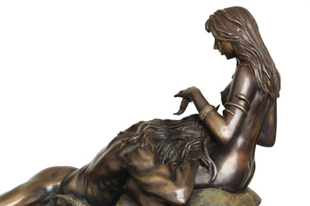 Richards mastery of human anatomy, combined with his unique surface modelling, creates a powerful Samson with all muscles wonderfully defined, now relaxed, symbolizing his approaching weakness as his body seems to melt into Delilah’s body. Delilah is haughty, triumphant, part of the scene, but still erect and distant, almost regal, as she looks down on her victim with a Mona Lisa smile on her slightly curled lips. Samson reflects the epitome of masculine physical excellence. Delilah reflects the epitome of feminine beauty, with small firm breasts, flowing back and hips with two beauty dimples accentuating her pelvic curves.