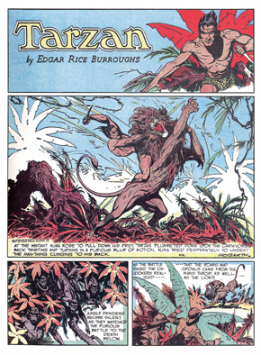 (audio sequence extracted from one of Weissmüller's Tarzan movies) RADIO AND TELEVISION Tarzan has been and remains the hero of many popular radio programs (now over 1,000 radio programs) and has been a primary television force for the past 100 years. TARZAN LIVES! TARZAN ANIMATION AND ANIMÉ Disney’s animated Tarzan (1999) marked a new beginning for the Ape Man followed by the Japanese Animé “Jungle, no Quja Ta-chan” (King of the Jungle Ta-chan) series. TARZAN LIVES! TARZAN COMICS Tarzan has also dominated the comics for almost 100 years. Tarzan became the immediate hero of United Feature Color Sunday Comics decades before other comic heroes (Superman, Batman, Spiderman, etc.) were conceived and before DC and Marvel Comics (Iron Man, Hulk, Thor, etc.) was even born. Hal Foster, the famous Canadian illustrator who changed the face of comics with his Prince Valiant series, was selected by Burroughs to depict his Tarzan. Foster put his mark on Tarzan from 1929 to 1936. Then, in 1936, the great unsurpassed illustrator and master anatomist Burne Hogarth undertook to draw Tarzan. At this time, Tarzan, the “Lord of the Jungle”, had already been in existence for 22 years in the novels of Edgar Rice Burroughs; he had been a character in the movies for 20 years; he had been a comic strip hero for 18 years. A student of Michelangelo and the great Baroque artists, Hogarth brought his illustrator’s skills and anatomical mastery to establish a new lasting image of Tarzan for United Features and the world, raising the level of comics to an art form. TARZAN LIVES! “They say it is never too late to have a happy childhood. So, pushing age 84 this 17 August, I am now enjoying my second childhood.” “As I get older, I go back to the days of my youth and my wonderful memories of Edgar Rice Burroughs’ Tarzan, the gripping cliff hanger Johnny Weissmuller black-and-white movies with his classic Tarzan Yell, Burne Hogarth’s pace-setting anatomical Tarzan comic strips, and even Walt Disney’s contemporary Tarzan animation.” “My TARZAN is young, muscular, slim. He is airborne, defying gravity as he soars through the trees swinging from vine to vine, long hair wild and flowing, exuberant with his mouth wide open as he gives his famous Tarzan yodel yell. I have added his Leopard Skin Loincloth, his knife, bow and quiver of arrows. Finally, he is surrounded by Jungle vines and trees. His outstretched left arm grips a vine as he soars through the air. His outstretched right arm reaches out for the viewer.” “There are two bases: The first base has a hidden turntable inside allowing the viewer to rotate the sculpture around at will. The first base sits on a second base. This base has a special sound system enclosed. A button in the base, when pressed, will activate a recording of Tarzan’s classic yell ... which will fill the room and let everyone know that “TARZAN LIVES!” “I’m having fun! Life is good! After all, it’s my second childhood.” “I hope you enjoy this sculpture half as much as I enjoyed creating it.” Sincerely