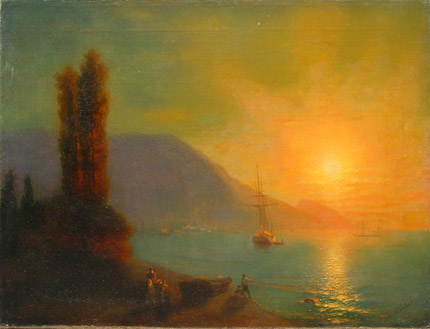 IVAN AIVAZOVSKY (1817-1900) Ivan K. Aivazovsky (July 29, 1817 – May 5, 1900) was an Armenian-Russian world-renowned painter living and working in Crimea, most famous for his seascapes, which constitute more than half of his paintings. Aivazovsky is widely considered as one of the greatest seascape painters of all times. Aivazovsky was born in the town of Feodosiya (Theodosia), Crimea (Russian Empire) to a poor Armenian family. His brother was the Armenian Archbishop Gabriel Aivazovsky. His family moved to the Crimea from Galicia (then in southern Poland, now in Ukraine) in 1812. His parents' family name was Aivazian but in Poland it was written Haivazian. Some of the artist's paintings bear a signature, in Armenian letters, "Hovhannes Aivazian". His father taught him to play the violin and speak Polish and Ukrainian fluently. His talent as an artist earned him sponsorship and entry to the Simferopol gymnasium №1 and later the St.Petersburg Academy of Arts, which he graduated with a gold medal. Earning awards for his early landscapes and seascapes, he went on to paint a series of portraits of Crimean coastal towns before travelling throughout Europe. In later life, his paintings of naval scenes earned him a long-standing commission from the Russian Navy stationed in the Black Sea. In 1845, Aivazovsky went to İstanbul upon the invitation of Sultan Abdülmecid I, a city he was to travel to eight times between 1845–1890. During his long sojourn in İstanbul, Aivazovsky was commissioned for a number of paintings as a court painter by the Ottoman Sultans Abdülmecid, Abdulaziz and Abdulhamid, 30 of which are currently on display in the Ottoman Imperial Palace, the Dolmabahce Museum and many other museums in Turkey. His works are also found in dozens of museums throughout Russia and the former Soviet republics, including the Hermitage Museum in Saint Petersburg. The largest collections of his works are at the Aivazovsky Art Gallery in Feodosiya, Ukraine, and the National Gallery of Armenia. At 31, Aivazovsky married Julia Graves, an English governess in St. Petersburg. They had four daughters. The marriage was dissolved, and at the age of 65, Aivazovsky, married Anna Boornazian, a young Armenian widow from Theodosia. Aivazovsky was deeply affected by the Hamidian massacres of Armenians in Asia Minor in 1895, painting a number of works on the subject such as "The Expulsion of the Turkish Ship," and "The Armenian Massacres at Trevizond." and renouncing a medal which had been awarded to him in İstanbul. He spent his last years in Feodosia where he supplied the town with water from his own estate, opened an art school, began the first archaeological excavations in the region and built a historical museum. Due to his efforts a commercial port was established at Feodosiya and linked to the railway network. Aivasovsky died in Feodosiya in 1900. Aivazovsky is best known for his seascapes and coastal scenes. His technique and imagination in depicting the shimmering play of light on the waves and seafoam is especially admired, and gives his seascapes a romantic yet realistic quality that echoes the work of English watercolorist J. M. W. Turner and Russian painter Sylvester Shchedrin. Especially effective is his ability to depict diffuse sunlight and moonlight, sometimes coming from behind clouds, sometimes coming through a fog, with almost transparent layers of paint. A series of paintings of naval battles painted in the 1840s brought his dramatic skills to the fore, with the flames of burning ships reflected in water and clouds. He also painted landscapes, including scenes of peasant life in Ukraine and city life in İstanbul. Some critics have called his paintings from İstanbul Orientalist, and others feel the hundreds of seascapes can be repetitive and melodramatic. Aivazovsky became the most prolific Russian painter of his time. Early in his career, he was elected a member of five Academies of Fine Arts, including those of St. Petersburg (his Alma Mater). Rome, Florence, Stuttgart and Amsterdam. He was an Academician at 27, and Professor of Marine Painting at the Academy of Fine Arts, St. Petersburg, at the age of 30. His works were highly appreciated by J.W.M. Turner, a leading English landscape and marine painter, when they met in Rome, in 1842. The art of the young marine painter Aivazovsky inspired Turner to devote a poem to him. Aivazovsky left over 6,000 works at his death in 1900. The funds earned during his successful career as an artist enabled him to open an art school and gallery in his hometown of Feodosiya. As of 2006, Aivazovsky's works have been auctioned for as much as $3,200,000, and his international reputation continues to grow. On June 14, 2007 his painting "American Shipping off the Rock of Gibraltar" sold for 2,710,000 pounds, "the highest price paid at auction for Aivazovsky". He is also said to be the most forged of all Russian painters. On April, 2012, Ivan Aivazovsky’s canvas View of Constantinople and the Bosphorus was sold at Sotheby’s auction in London for a record $5.2 million (3.2 million pounds). From Wikipedia |