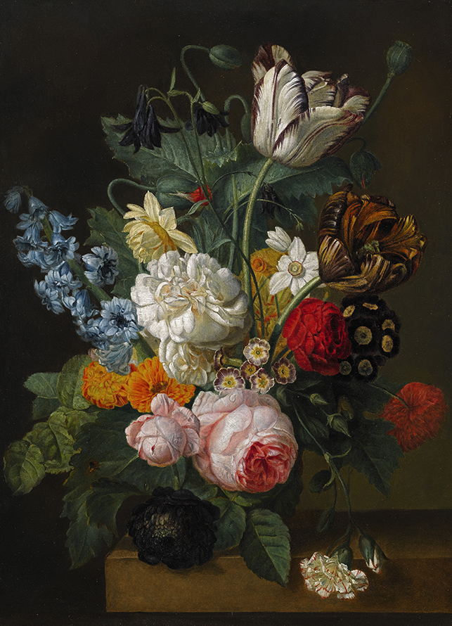 Gerard was born in Tilburg, an older brother of Cornelis van Spaendonck (1756–1840), who was also an accomplished artist. In the 1760s he studied with decorative painter Willem Jacob Herreyns (also known as Guillaume-Jacques Herreyns) (1743–1827) in Antwerp. In 1769 he moved to Paris, where in 1774 he was appointed miniature painter in the court of Louis XVI. In 1780 he succeeded Madeleine Françoise Basseporte (1701–1780) as professor of floral painting at the Jardin des Plantes, and shortly afterwards was elected as a member of the Académie des beaux-arts. Among his pupils were Pierre-Joseph Redouté and Henriette Vincent. Gerard van Spaendonck painted with both oil and watercolours. He contributed over fifty works to the Vélins du Roi, a famous collection of botanical watercolours possessed by French royalty. From 1799 to 1801 he published twenty-four plates of Fleurs Dessinees d'apres Nature (Flowers Drawn from Life), which were high-quality engravings for students of floral painting. Today, Spaendonck's Fleurs Dessinées d'après Nature is a highly treasured book on floral art. In 1788 he was appointed adviser to the Académie, and in 1795 became a founding member of the Institut de France. In 1804 he received the Légion d'honneur and soon afterwards was ennobled by Napoleon Bonaparte. Spaendonck died in Paris in 1822 and is buried in the Père Lachaise Cemetery. From Wikipedia |