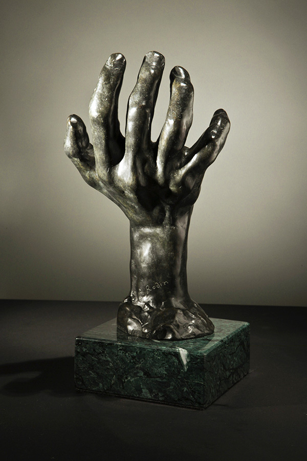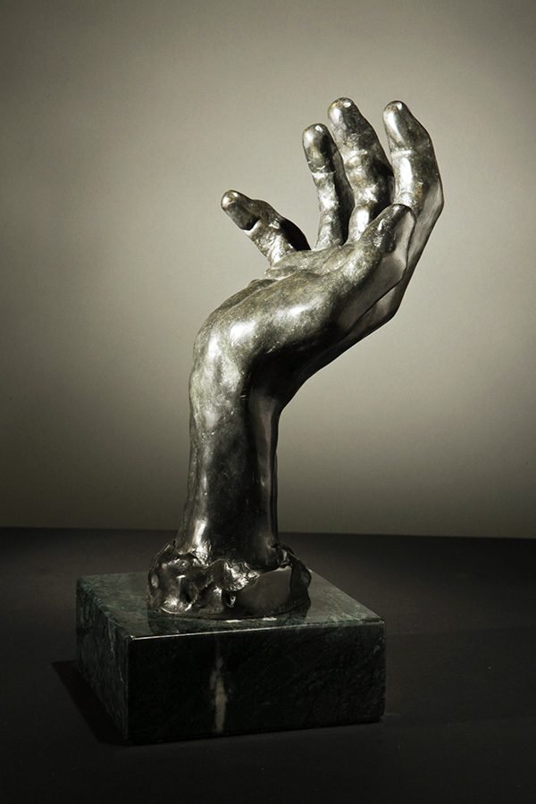 Is this hand clutching or unfolding? Reaching upwards or pulling something downward? In this study of a hand, Rodin creates fortuitous ambiguities. We may interpret it in a number of ways and may see its form a complete and self contained or as a fragment. It is an excellent example of Rodin's idea that a detail or single motif may suggest a range of meanings. |