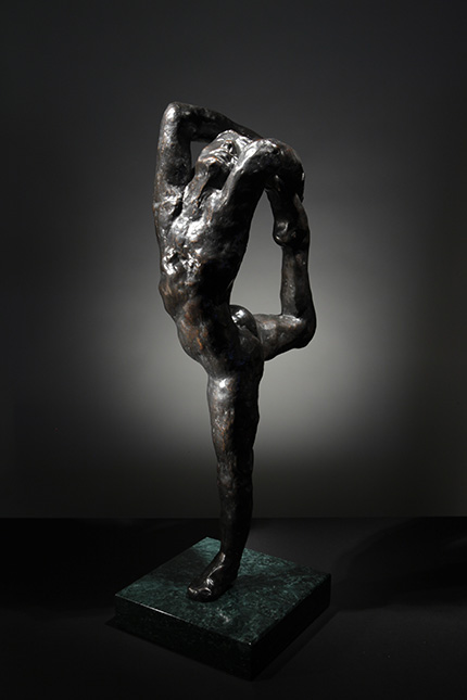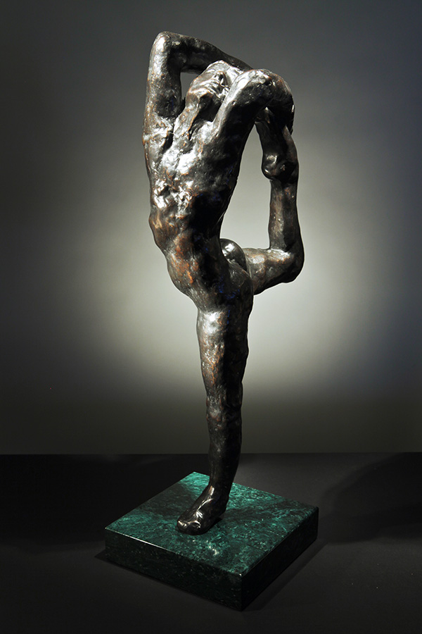 Far larger than the other figures in the series, "Dance Movement A" achieves a form which is both representational and abstract. Rodin has abandoned much of the anatomical precision which characterizes his earlier work. Instead he has treated the figure in a summary fashion so that he might capture its energy and emphasize the dynamic circular form achieved by the dancer as she reaches back with both hands to grasp her right foot. The clarity and energy of "Dance Movement A" finds a close affinity with the figures in Henri Matisse's dance pictures of 1910-1912.
